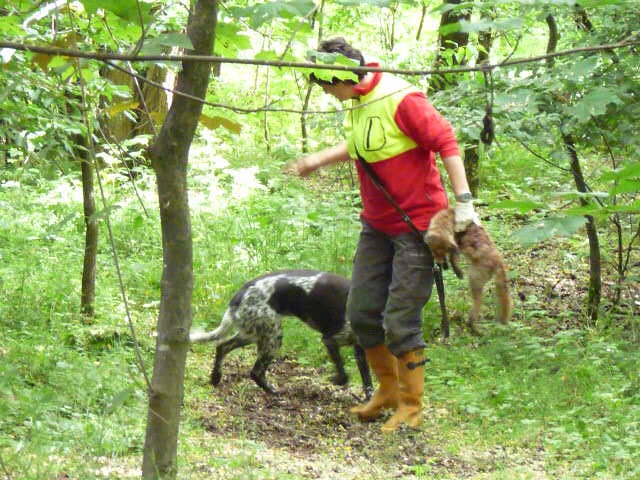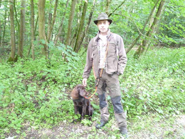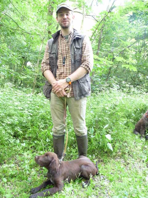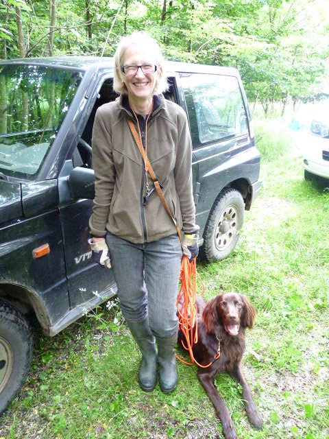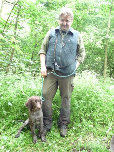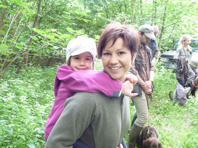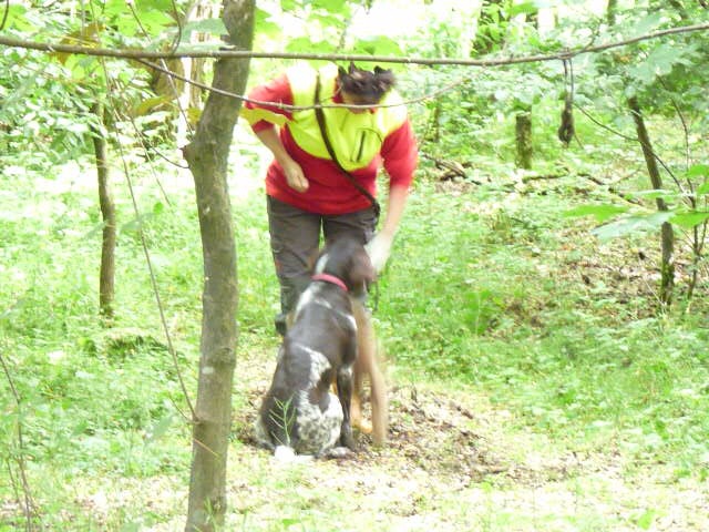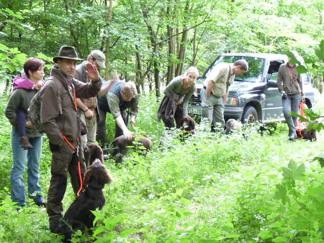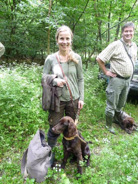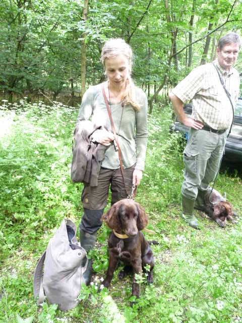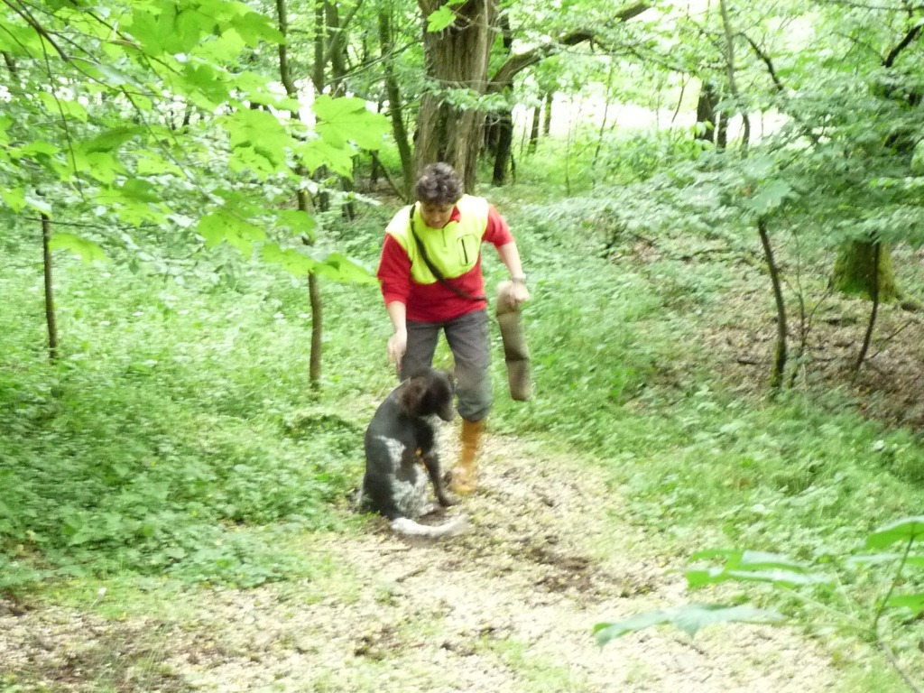 Gestärkt und langsam-gefüttert ging es dann in den Elmpter Wald. Isabell lud zu ihren gefürchteten Kreisspielen mit „Triller-Down-bis-der-Arzt-kommt“. Zwischendurch befreite Jörg die Hundeführer und jeder bekam eine vorbereitete Schweissfährte, die Welpen erhielten jeweils eine Futterschleppe. Gegen 18 Uhr wurden dann alle zum Gruppenfoto zusammengerufen und die ersten verabschiedeten sich müde, aber auch zufrieden und beeindruckt nach diesem Tag mit vollem Programm.