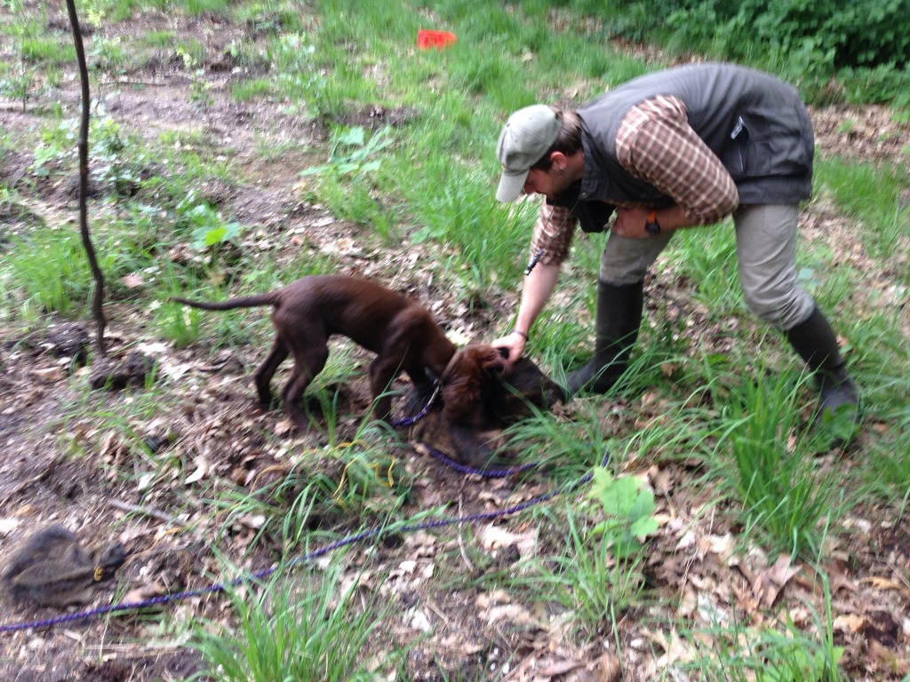 Gestärkt und langsam-gefüttert ging es dann in den Elmpter Wald. Isabell lud zu ihren gefürchteten Kreisspielen mit „Triller-Down-bis-der-Arzt-kommt“. Zwischendurch befreite Jörg die Hundeführer und jeder bekam eine vorbereitete Schweissfährte, die Welpen erhielten jeweils eine Futterschleppe. Gegen 18 Uhr wurden dann alle zum Gruppenfoto zusammengerufen und die ersten verabschiedeten sich müde, aber auch zufrieden und beeindruckt nach diesem Tag mit vollem Programm.