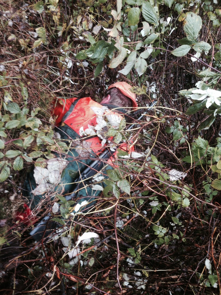 Bei sommerlichen Temperaturen von gefühlten 35 Grad für Hund (unter den Westen) und Führer (in der Nachsuchenhose) ging es erstmal durch eine große Hochwaldfläche. Insgesamt war das gesamte Revier mit relativ steilen Hängen durchzogen und an diesem warmen Herbsttag für alle eine anspruchsvolle Aufgabe.