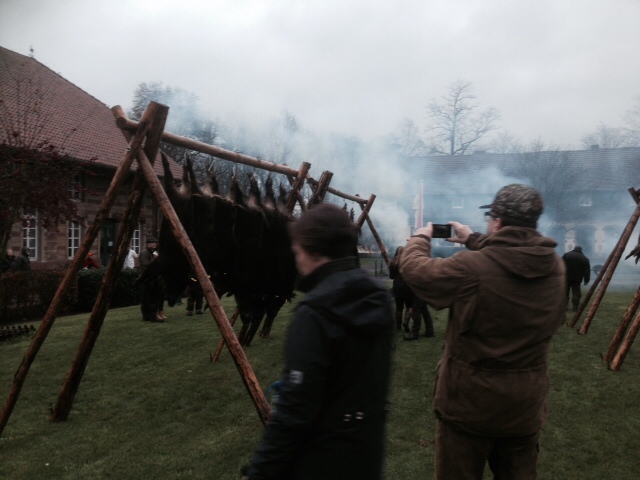 Das Wild wurde permanent in Bewegung gehalten. Die Hunde arbeiteten sehr gut miteinander. Sie gingen trotz hohem Rehwild Besatz nicht zu weit und nur Grisha überjagde etwas und schlug sich einer anderen Treiberwehr bei. Dort jagde er sehr selbständig vor allem an Sauen. Er wurde nach dem Treiben mit zum Linslerhof gebracht. Caja, Hunter und Fozzi machten mehrfach Sauen hoch die sich in Dornenbüschen eingeschoben hatten. Hier wurde ein Überläufer beschossen und kurz darauf von Fozzi und Adenauer gestellt und gehalten. Kurz darauf kamen Hunter und Caja dazu und Andreas konnte seine erste Sau mit der kalten Waffe abfangen. Kurz darauf waren die Hunde wieder hinter Sauen laut und Caja griff einen Frischling (25kg) und hielt ihn bis zum Eintreffen der anderen Hunde. Auch hier konnte Andreas mit Guido seinen ersten Frischling abfangen wofür er auch einen Bruch erhielt. Er hat sich sehr gefreut und wir mit ihm. Ein erfolgreicher Jagdtag ging dann mit Glühwein und Schüsseltreiben zu Ende. Die Jagdschule war sehr zufrieden mit unserer Gruppe und wir sollen auf jeden Fall wieder kommen. Uns hat es sehr gut gefallen und die Organisation war mehr als hervorragend. Es lagen am Ende 22 Sauen und 23 Rehe auf der Strecke, wobei es noch Nachsuchen gibt, da jeder Schuss kontrolliert wird.