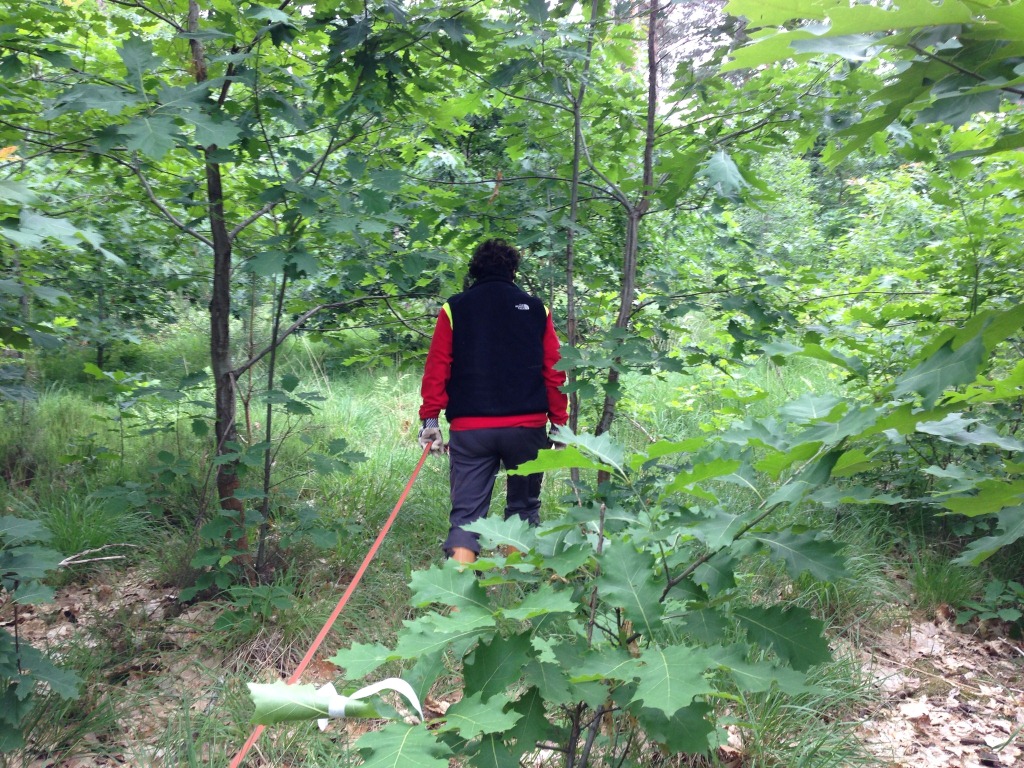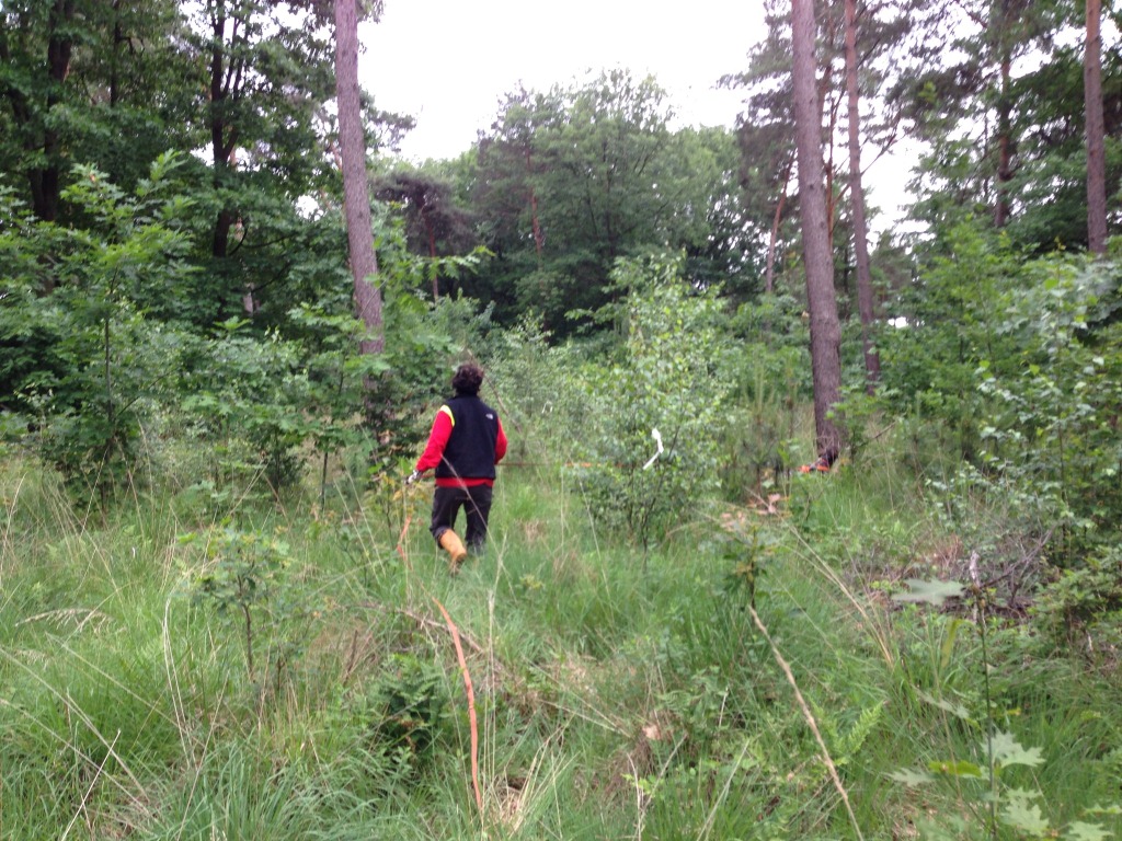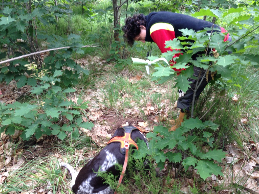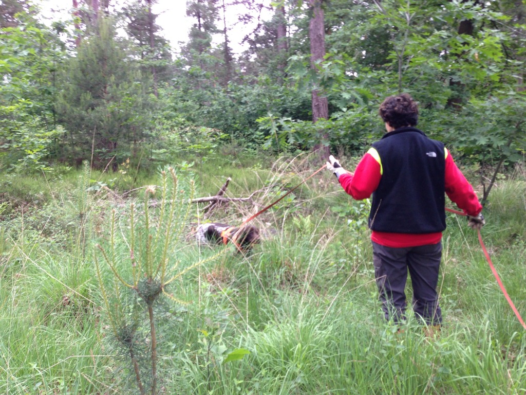 Gestärkt und langsam-gefüttert ging es dann in den Elmpter Wald. Isabell lud zu ihren gefürchteten Kreisspielen mit „Triller-Down-bis-der-Arzt-kommt“. Zwischendurch befreite Jörg die Hundeführer und jeder bekam eine vorbereitete Schweissfährte, die Welpen erhielten jeweils eine Futterschleppe. Gegen 18 Uhr wurden dann alle zum Gruppenfoto zusammengerufen und die ersten verabschiedeten sich müde, aber auch zufrieden und beeindruckt nach diesem Tag mit vollem Programm.